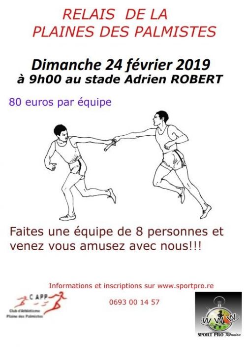 Le Relais de La Plaines des Palmistes est une épreuve de 24 km en relais de 8 coureurs (3 km par coureur) disputée au cœur du village de La Plaine des Palmistes.