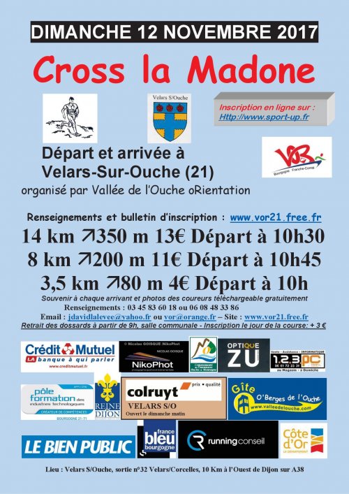 22 ème édition du Trail de ma Madone, organisée par Vallée de l'Ouche oRientation. ** Pour se rendre à Vélars sur Ouche ** : A38 - Sortie N° 32 (Vélars - Corcelles) - 10 km à l'ouest de Dijon, direction Paris.