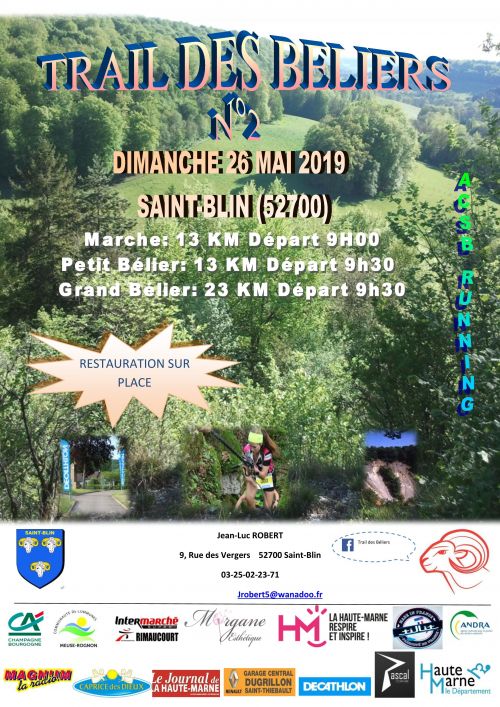 L ACSB Running de SAINT BLIN organise le Trail des Béliers , cet événement réunira trois épreuves. les parcours emprunteront les forêts Saint Blinoises en direction du village d'Orquevaux pour gagner ,le site du cul du cerf ; curiosité naturelle du département. Accueil. buvette .restauration.remise des récompenses au gymnase de SAINT-BLIN.