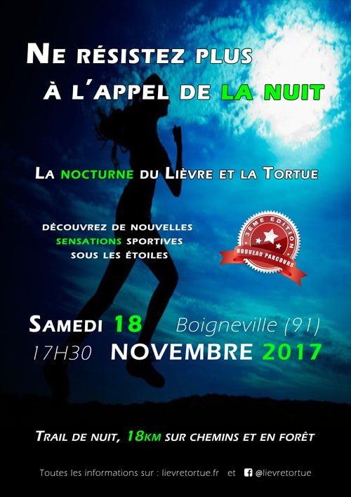 3ème édition, trail en auto suffisance de nuit, prévoir frontale, avec un départ proche de la gare RER de Boigneville. Une seule boucle, tout terrain, accessible à tous, idéal pour un 1er trial de nuit. un buffet d’après course offert à chaque participant !