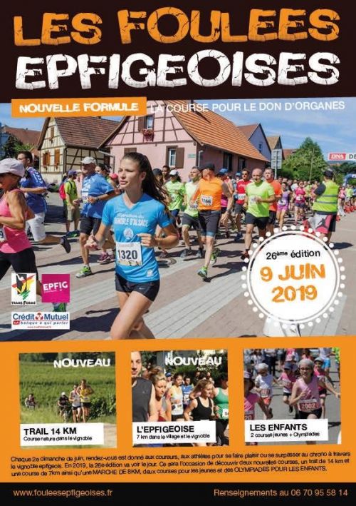 Les Foulées Epfigeoises vous proposent pour la 26 ème édition deux nouvelles courses : un trail de 14 km dans le vignoble et une course de 7 km ainsi qu’une marche de 8km, deux courses pour les jeunes et des olympiades pour les enfants.