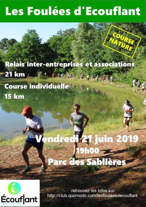 Les Foulées d'Ecouflant 3ème édition avec 2 courses "Nature" dans le parc des Sablières d'Ecouflant. 1 relais (3 coureurs x 6,6 Km): Relais des Sablières => relais inter entreprises - inter associations 1 course 20 Km: Course des Basses Vallées => course individuelle