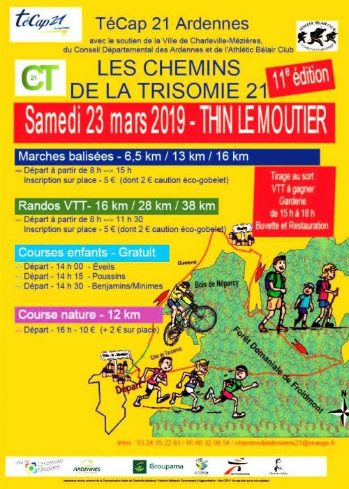 Journée organisée par l'association Trisomie 21 Ardennes. A chacun son défi !.. parcours marches, vtt / courses réservées aux jeunes à partir de 14h30 / Trail nature (16 heures), les Chemins de la Trisomie proposent un parcours sur les chemins et sentiers (forêt de Thin le Moutier)