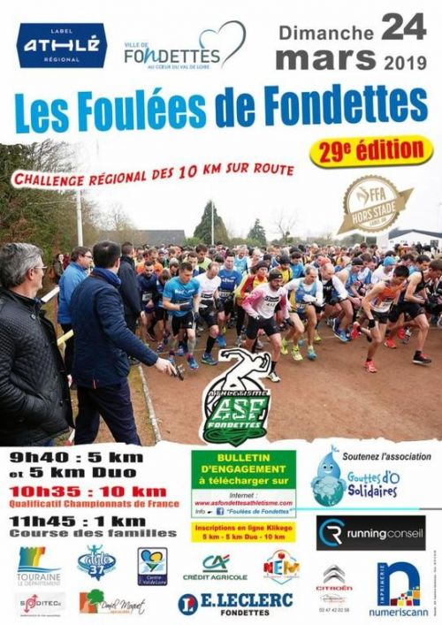 29ème foulées de Fondettes, 5km, 10km qualificatif aux Championnats de France et 1km , course des familles au profit de l'association Gouttes d'O Solidaires qui vient en aide aux populations démunies au Vietnam. Nouveauté cette année, le 5km pourra être couru en DUO