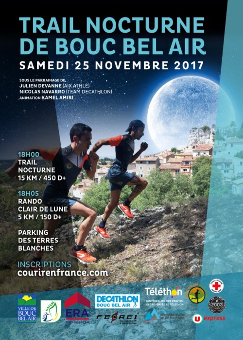 La 3e édition du Trail Nocturne de Bouc-Bel-Air aura lieu le Samedi 25 Novembre à 18H. Une marche nordique / Rando au clair de lune limitée à 150 participants est également organisée. Une partie des fonds sera reversée au Téléthon via la mairie de Bouc-Bel-Air.