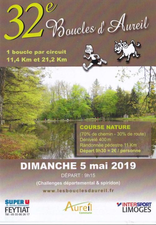 Les deux épreuves des Boucles d'Aureil sont inscrites au calendrier officiel du CDCHS87. Une boucle de 11,400km et une boucle pour le 21.200 km fléchées en jaune sur le sentier du pigeonnier (70% de chemin - 30% de routes). Cette course est praticable par tous, débutants et habitués.