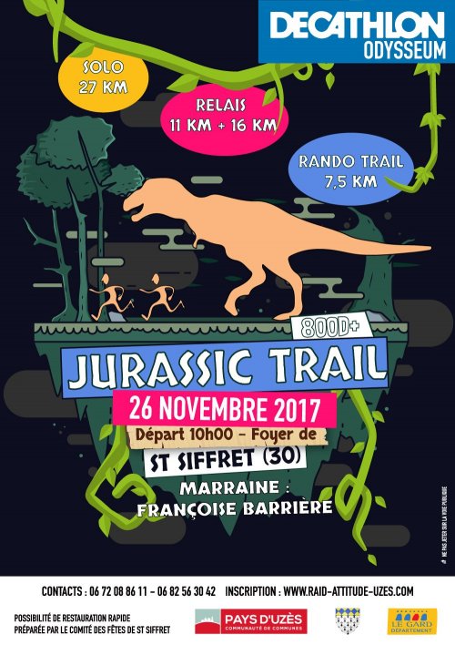 Pour la 8ème édition le Jurassic trail pourra se faire en solo ou en relais de 2 (11km et 16km). Il partira de Saint-Siffret. Le parcours fait de relance et de passages techniques, restera inchangé par rapport à l'année dernière. Un buffet sera servi aux coureurs à la fin de l'épreuve. Rando'Trail : 7.5km non chronométré