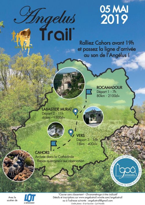 OBJECTIF ARRIVER AVANT 19H AU SON DE L'ANGELUS. Temps à titre indicatif - Pas de chronométrage à l'arrivée Ravitaillement au coeur des villages traversés avec possibilité de restauration pour le public et les accompagnants à Labastide-Murat à partir de 11h. Nombreuses animations avec visite de la cathédrale et de son cloître.