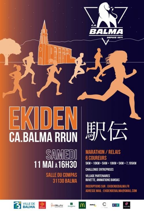 Venez participer à l'Ekiden de Balma. Un marathon relais en équipe de 6 coureurs: 5km - 10km - 5km - 10km - 5km - 7,195km. Un événement organisée par le CA Balma Officiel et RRUN Toulouse. Ambiance assurée: bandas, Photo Booth, buvette et village partenaires.