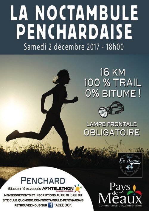 La 3è édition du Trail LA NOCTAMBULE PENCHARDAISE sera organisée par l’association LA TEAM EX AEQUO avec un départ à 18h à l'occasion du TELETHON 2017. La course se déroulera selon les règles édictées par la Fédération Française d’Athlétisme. L'épreuve est ouverte à tout coureur né en 1999 et avant.