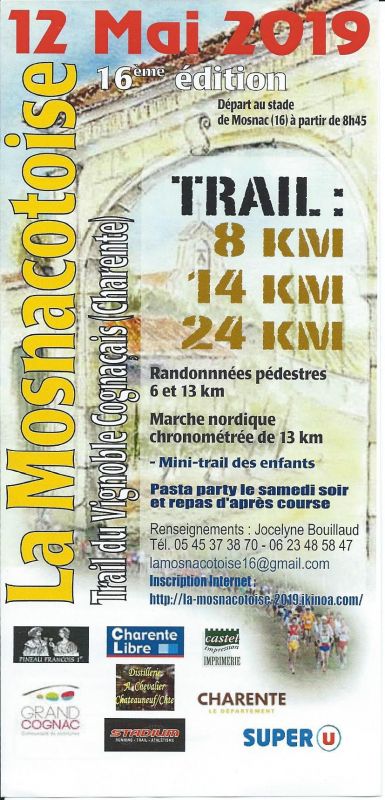 La Mosnacotoise, Trail du Vignoble Cognaçais. Pour la 16ème édition dans notre petit coin de Charente, vous traverserez campagne, vignes, sous-bois, distillerie, ruines de vieux moulin, et vous pourrez contempler lavoirs, écluses, pêcheries, points de vue sur la vallée du fleuve Charente. Avec notre cadeau de bienvenu, les récompenses sportives, les lots du tirage au sort et la visite de fermes productrices vous dégusterez nos produits régionaux.
