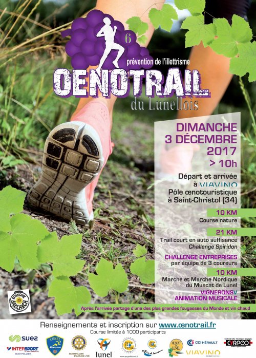 Course ludique (fanfare et déguisements), culturelle (traversées de châteaux), sportive (environ 150m de D+), dégustative (clin d'oeil aux vins du lunellois) et caritative puisque qu'au profit de l'illettrisme et des maladies respiratoires, l'Oenotrail installe son village départ/arrivée au pôle oenologique Viavino et se décline en 4 courses (trail court, trail découverte, marche nordique et marche). Une bouteille de vin et une part de fougasse géante offertes à tous les participants.
