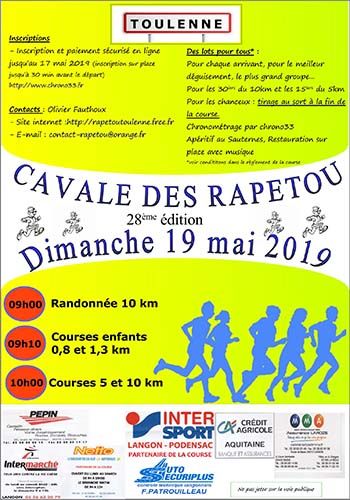 Cette année encore, le club de course des RAPETOU vous attend au complexe sportif de Toulenne pour sa traditionnelle Cavale des Rapetou. Seul, en famille ou entre amis, venez prendre le départ de cette course conviviale ! Des lots attendent les 3 premiers de chaque catégorie…