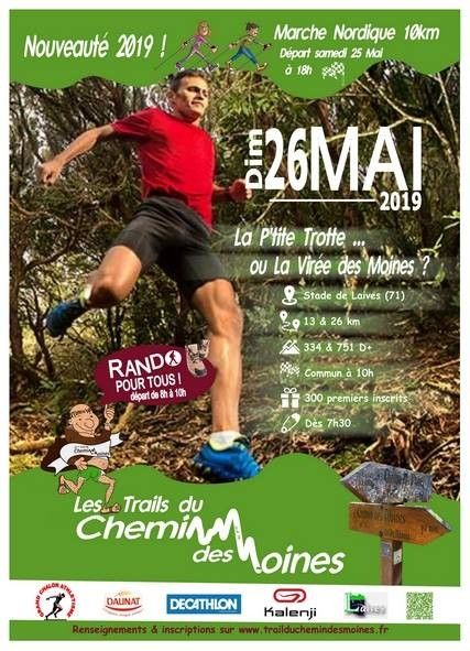 15ème édition du Trail du Chemin des Moines organisée par le Grand Chalon Athlétisme. Départ et arrivée à Laives en Bourgogne du sud. A 2 kms à l'ouest de Sennecey le Grand, Laives, village typique de l'architecture rurale bourguignone, est à proximité de la côte chalonnaise avec ses noms prestigieux : Givry, Buxy, Rully, Montagny, Mercurey... Depuis le parcours, on découvre la vallée de la Grosne, le chalonnais, la Bresse, le Jura et les Alpes.