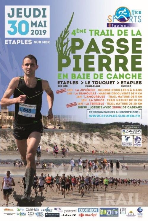 Trail de la Passe Pierre en Baie de Canche organisé par l'Association Office du Sport Etaplois. Le départ d’Etaples-sur-mer direction Le Touquet pour traverser La Canche, base Nord du Touquet, remonter le long de la digue du Touquet, sur la plage le long de la route en corniche, sur la plage en face du sentier de la baie.