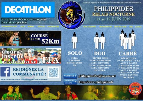 Philippidès est une course de nuit d’environ 55 km autour de la ville d’Agen (47). Le circuit traverse les communes de : Pont-du-Casse, Foulayronnes, Agen, le Passage-d ’Agen, Rochefort, Estillac, Moirax, Layrac, Castelculier, Boé et Bon-Encontre.