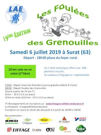 19ème édition des 10 Km des Foulées des Grenouilles, organisée par l'association Limagne Athlète Endurance. En plus du traditionnel 10 km en deux boucles, une course relai (2 fois 5km) vous est proposée et courue dans le même temps.