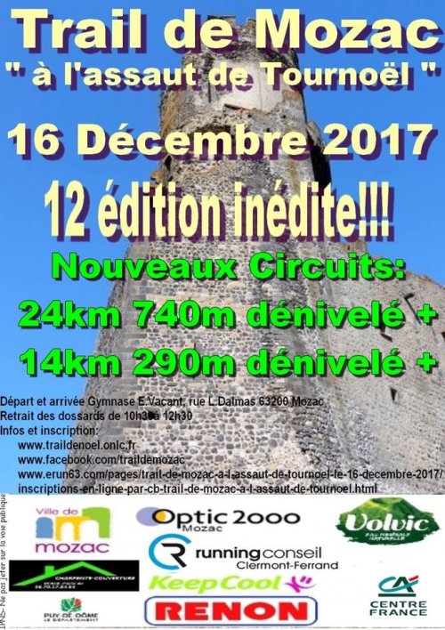 12ème et inédite édition du Trail de Mozac "A l’assaut de Tournoël". Le « Trail de Noël » est une épreuve nature de course à pied. Notre course se veut dans « l’esprit trail » avec un parcours varié, du dénivelé, et un maximum de passage dans la nature. Afin de préserver la qualité de ce Trail, pour que chacun profite de l’environnement et soit bien servit aux ravitaillements … nous limitons l’épreuve à 800 traileurs.