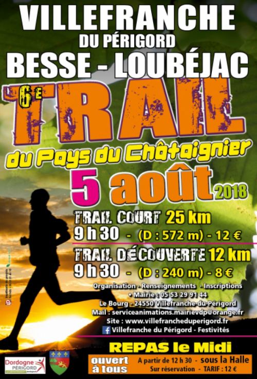 7ème édition du TRAIL du Pays du Châtaignier. Venez participer ou encourager les coureurs du Trail du Pays du Châtaignier à Villefranche du Périgord (passage à Loubéjac et Besse), organisé par la mairie.