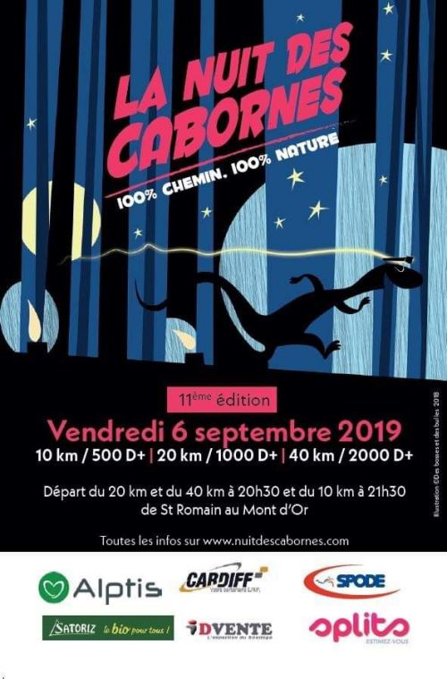 L’association sportive Saône Mont d’Or Nature organise la 10 ème édition de la Nuit des Cabornes, un trail nocturne comportant 3 épreuves. La course se déroule sur des chemins et quelques traversées de routes communales, sur un circuit relativement technique. Le dénivelé positif est de 2000 mètres pour le 40 km et 1000 m pour le 20 km et de 500 mètres pour le 10 km.