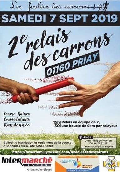Course de 18 kms par équipe de 2. chaque coureur parcours 9 kms. (2 boucles identiques de 9 kms, le relais s'effectuera sur la ligne de départ et 2 coureurs finiront les 500 dernier mètres ensemble). Parcours variés et nature sur les hauteurs de Priay.
