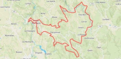 Le parcours commencera en empruntant un sentier, à travers bois, muré de pierre. Vous descendrez ainsi jusqu'au départ de la Via ferrata de Grand Bois ( 2 tyroliennes, sans les emprunter) et remontrai jusqu'à l'arrivée de celle-ci. Au 2.5 Km, vous passerez au travers des ruines du Château de Châtel-Montagne et continuer votre parcours jusqu'à son église mythique. Après une alternance de sous-bois, chemin, sentier vous arriverez, au 6 Km, sur un petit passage technique en sous-bois.