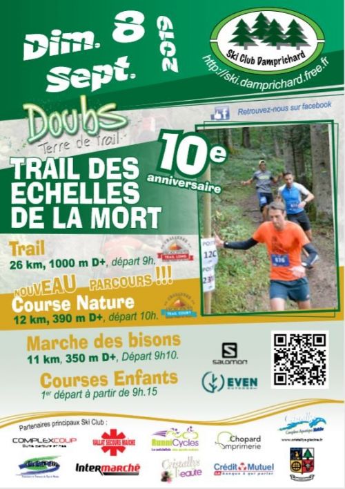 10ème édition du trail des échelles de la Mort organisé par le Ski Club de Damprichard. La première course a été crée en 1985 avec des passages jusqu’en Suisse, plusieurs éditions de courses de triathlon (course à pied, VTT, ski à roulette), ensuite le Tour du plateau 21km, et depuis 2009 le Trail des Echelles de la Mort. Le Trail se déroule dans les côtes du Doubs majoritairement dans un sens inverse mais toujours en montant les Echelles.