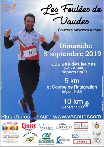3ème édition des Foulées de Vaudes. Le parcours change légèrement pour améliorer le spectacle. Départ et arrivée Grande Rue face à la mairie de Vaudes. Chronométrage du 5 et 10 km par puce.