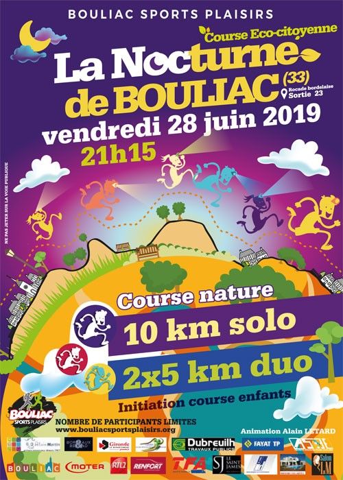 Epreuve de 10 km sur les routes et chemins de Bouliac, : Circuit de 2 boucles de 5 km avec un départ à 21 h 15, Course en nocturne sur un site exceptionnel aux portes de l'agglomération de Bordeaux, Nombreux public et animations permanentes.