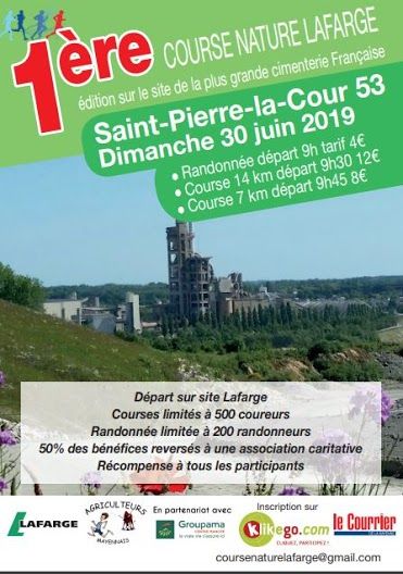 Courses nature Lafarge organisées par Le club des Agriculteurs Mayennais et Lafarge avec 2 circuits de 7 et 14 km et une randonnée de 8 km sur le site Lafarge.