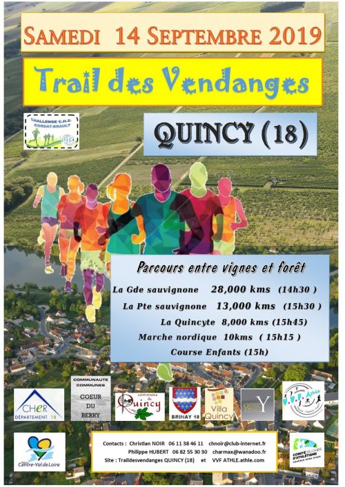Le Trail des vendanges est organisé par le club VVF ATHLE, les communes de QUINCY, BRINAY, PREUILLY, CERBOIS et les associations de Quincy. Le Trail des vendanges est un évènement sportif proposant trois épreuves de course et une marche nordique de pleine nature entre les villages de Quincy, Brinay, Preuilly traversant les vignobles et la forêt.