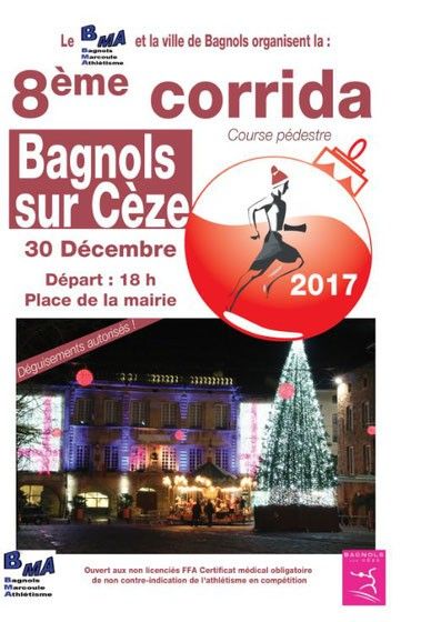 8ème Corrida des Fetes de Noel de Bagnols. Course ouverte à partir de la catégorie cadet, pas de course enfant. Ouvert aux non licenciés FFA, certificat médical obligatoire de non contre-indication de la course à pieds en compétition de moins d'un ans.