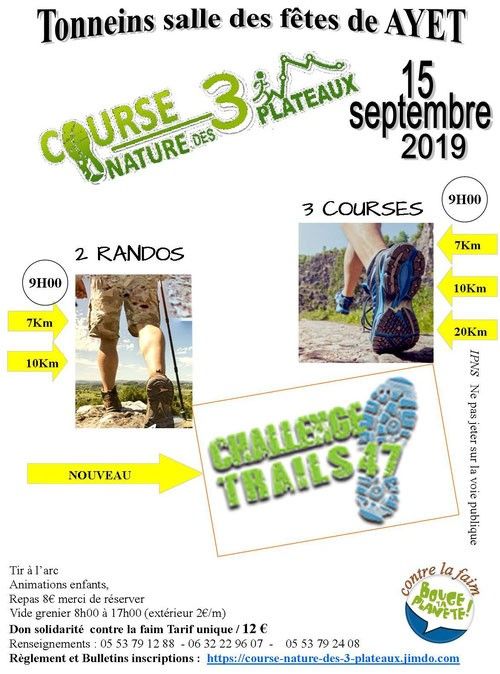 La manifestation de solidarité internationale « Bouge ta planète » organise, pour défendre,soutenir et promouvoir les droits humains fondamentaux dans le monde, une "Course nature des trois plateaux" CN3P. Parcours presque entièrement en nature. Tracé agréable, "accidenté" (non adapté à la marche athlétique). Ouvert aux coureurs seulement.