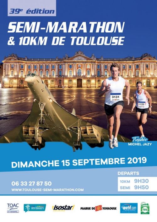 39ème édition du Semi Marathon et 10 km de Toulouse. Le parcours démarre du complexe sportif de la société Airbus, il va vers Sesquières, emprunte le canal latéral des 2 mers en direction des ponts jumeaux, passe sous la rocade pour aller vers le mythique stade Toulousain rugby par la rue de troènes, pour arriver au complexe sportif de la société Airbus.