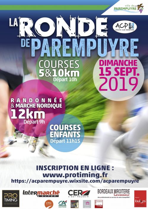 21ème édition de La Ronde de Parempuyre. Le parcours est très roulant, idéal non seulement pour les débutants mais aussi pour les coureurs plus aguerris désireux de réaliser un temps. Ce parcours est idéal pour battre votre record sur une de ces distances (10 Km ou 5 Km), avoir un chrono de référence après les vacances, récupérer du marathon Médoc, préparer une autre épreuve, servir de test VMA ou tout simplement prendre du plaisir ! Pour les enfants de 7 ans à 13 ans, "la Petite Ronde" avec deux courses gratuites au programme et un départ à 11h15 après les courses adultes.