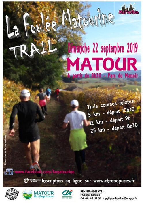 La Foulée Matourine revient avec 3 parcours 100% nouveaux. Toujours dans la convivialité, la bonne humeur, la simplicité mais aussi avec l'esprit de compétition, venez découvrir Matour et ses environs, souvent appelée la petite suisse, MATOUR est entre le haut clunisois, le mâconnais, le beaujolais et le charolais.