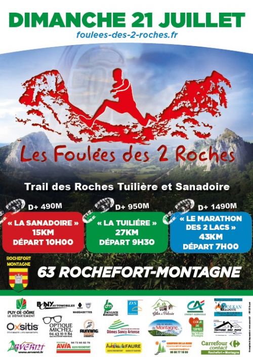 Les Foulées des 2 Roches avec 3 parcours au programme : la Sanadoire (trail de 15 km âge minimum 16 ans), la Tuilière (trail de 27 km âge minimum 18 ans) et le Marathon des 2 lacs (trail de 43 km age minimum 20 ans).