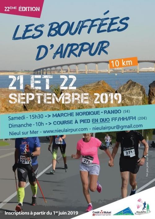 Le parcours de 10 kms longe la côte nieulaise avec une vue imprenable sur la Baie de l'Aiguillon et le Pont de l'Ile de Ré. Des récompenses seront offertes à chaque participant et de nombreux lots au tirage au sort. Course en duo => Femme/Femme ; Homme/Homme ; Femme/Homme