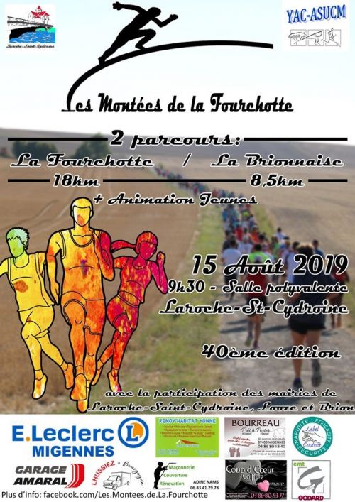 Course moitié route, moitié chemin. Départ commun avec la Fourchotte rue de l’étang à 9h30 - Arrivée devant la salle des fêtes de Laroche-Saint-Cydroine - Balisage à chaque kilomètre - 5 postes de ravitaillement sur le parcours. Catégories autorisées CA->V5.