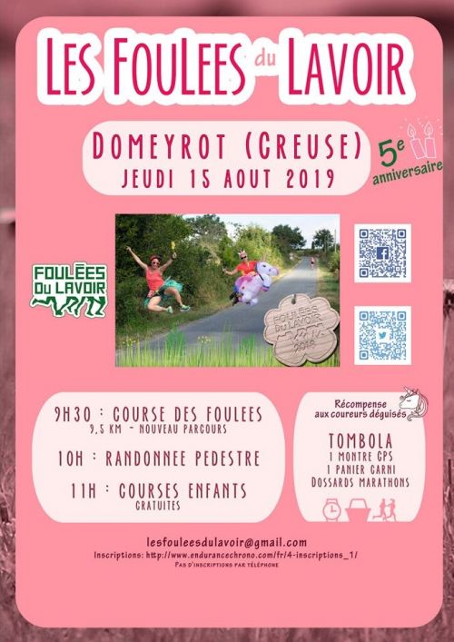 5ème édition des Foulées du Lavoir à Domeyrot, petit village de la CREUSE. Une course nature de 9,5kms dont le parcours change chaque année et qui a su trouver sa place au sein du paysage sportif Creusois et Limousin.