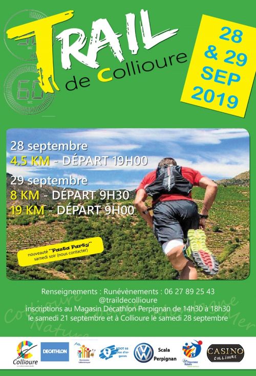 Dans le cadre de sublime du village catalan de Collioure, venez faire une randonnée de 7 kms ainsi qu’à un trail découverte de 8 kms, épreuve idéale pour découvrir les joies du nouveau sport à la mode. Pour les plus chevronnés, participez au magnifique trail de 19 kms, avec un dénivelé de l’ordre de 900m ! Et pour les 10 ans du TRAIL DE COLLIOURE, un trail nocturne de 4.5 kms dans les rues de Collioure!