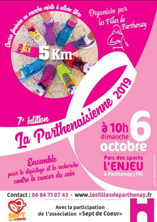 Course féminine de 5 km ouverte aux hommes déguisés en femmes, allure libre. Echauffement collectif par "Danse & Co" Marche mixte de 5 km dans le centre historique de Parthenay. Course et marche caritative en faveur du cancer du sein. les bénéfices sont donnés à la ligue contre le cancer. Echauffement course et marche Epreuve ouverte aux handicapé(e)s, Epreuve sans classement, Catégories autorisées MI->V5.