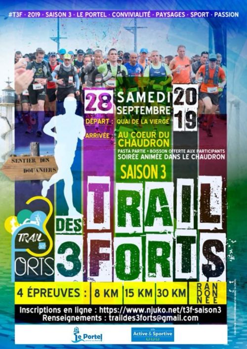 Trail des 3 Forts saison 3 à Le Portel, avec 3 parcours trail et une randonnée. Sous le signe de la convivialité et de l'éco-responsabilité, le T3F a été créé par des passionnés pour des passionnés. Au départ du Portel et jusqu'aux dunes d'Ecault, il vous emmènera sur les chemins côtiers d'Alprecht, les sentiers escarpés des falaises et vous donnera à voir les magnifiques paysages de notre littoral. Avec, finish exceptionnel, l'arrivée dans la salle du chaudron du Portel.