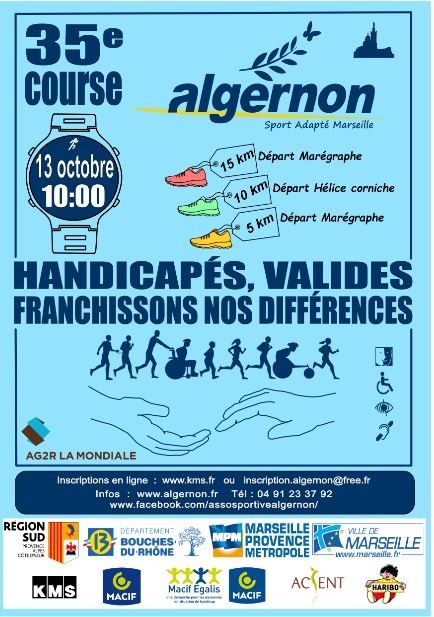 La 35e édition de la Course Algernon , c'est ce dimanche 13 octobre. Cette course pédestre à la particularité de regrouper, sur une même épreuve, coureurs valides et personnes handicapées mentales, physiques ou sensorielles. Ouverte à tous à partir de 14 ans, à allure libre, elle propose trois distances : 5 (départ Marégraphe), 10 (départ Hélice Corniche) et 15 km (départ Marégraphe), avec une arrivée commune sur les plages du Prado. Une trentaine d'animations sportives et culturelles, gtratuites et accessibles à tous, sont prévues sur les plages du Prado