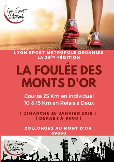 La foulée des Monts d’Or, c’est la première course d’importance régionale de l’année dans le département du Rhône. Elle est devenue une grande classique avec sa 25ème édition cette année. Cette course s’inscrit au lendemain des fêtes de fin d’année dans un esprit convivial et de bonne humeur. La Foulée des Monts d’Or, propose un parcours vallonné d’un peu plus de 25 kilomètres et 600 mètres de dénivelé +. Elle offre des points de vue sur la vallée de la Saône, la ville de Lyon et notamment Fourvière, sur les Alpes et le Mont Blanc. La Foulée est l’occasion, pour tous les coureurs de la région, d’une remise en forme après les excès des fêtes de fin d’année. Si la distance et le dénivelé peuvent effrayer certains coureurs, le relais à mi-distance permettra à un plus grand nombre de venir se tester sur un tout nouveau parcours.