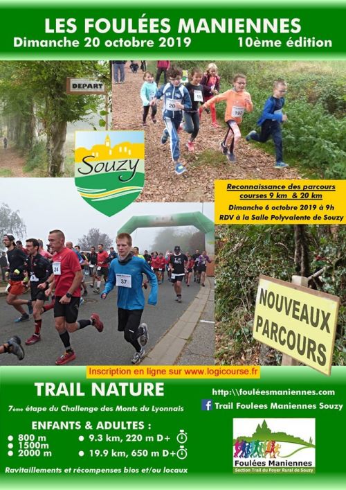 Le Trail des Foulées Maniennes est organisé par la section "Les Foulées Maniennes", section sportive placée sous la tutelle de l'association "Le Foyer Rural de Souzy". Trois courses enfants sont organisées (800 m, 1500 m et 2000 m), elles ne sont pas chronométrées. Lieu de l’épreuve : Souzy, départ et arrivée salle polyvalente. Parcours sur des chemins : 80% pour les adultes, 100% pour les enfants. Course ouverte aux femmes et aux hommes, licenciés (FFA/FFTRI) et aux non licenciés.