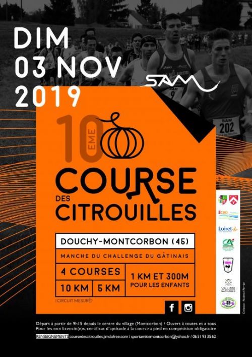 10ème Course des Citrouilles dans la commune de Douchy-Montcorbon. Epreuve du Challenge du Gâtinais, cet évènement est ouvert à toutes les personnes souhaitant passer un bon moment de convivialité sportive. D'année en année, la Course des Citrouilles rencontre un succès grandissant.