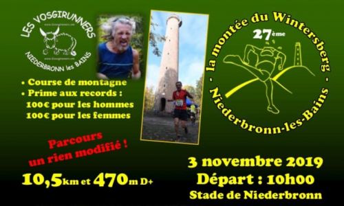Imaginez l’Automne dans toute sa splendeur, au cœur de la magnifique forêt des Vosges de Grès. Il fait soleil, une légère brume enveloppe la montagne, le vent fait bruisser les feuilles. Imaginez vous entrain de respirer, de courir, de vous dépasser dans ce cadre splendide. Ne résistez pas à l’appel de la forêt ! La Montée du Wintersberg va vous combler. Une course nerveuse, racée, sans concession, où chaque type de coureur pourra s’exprimer, quel que soit son terrain de prédilection : le plat pour ceux qui aiment le rythme, la montée pour les costauds, la descente pour les fadas de vitesse. Un véritable triathlon du coureur à pied ! Une véritable course de montagne qui se déroule chaque année à Niederbronn et nulle part ailleurs...