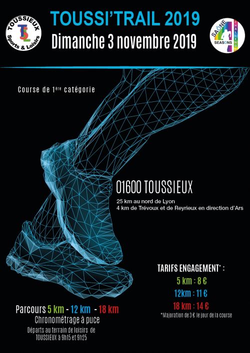 Toussieux Sports & Loisirs organise sa 16ème course pédestre : Le Toussi’Trail à travers chemins et sentiers (environ 80%). Vous avez la possibilité de parcourir l’une des 3 distances : 5, 12 ou 18 km. Nous vous rappelons que le nombre de dossards est limité à 200 pour le 5 km, 400 pour le 12 km et 400 pour le 18 km.