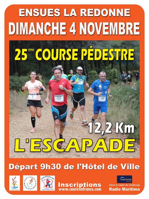 La course de l'Escapade (12,2 km) organisée par l'Escapade du Pied en collaboration avec la Municipalité. Comme l’an dernier, le départ et l’arrivée se feront depuis le parvis de l’Hôtel de Ville à 9h30. Course essentiellement dans la colline (pistes forestières). Panorama splendide sur la baie de Marseille !